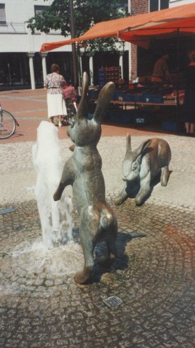 Brunnenanlage in Bronze (Heidehasen), Bronzeskulptur (Schuster) Profane Kunst - Brunnen in BronzeHeiden - Marktplatz