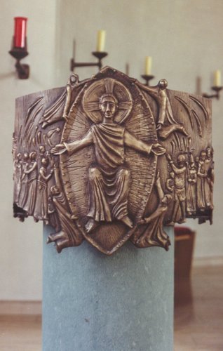 Seitenschiffenster in Glasmalerei, Ambo in Bronze und Anröchter Dolomit Sakrale Kunst - Altarraumgestaltung in verschiedenen MaterialienWetter-Wengern / Ruhr - St. Liborius